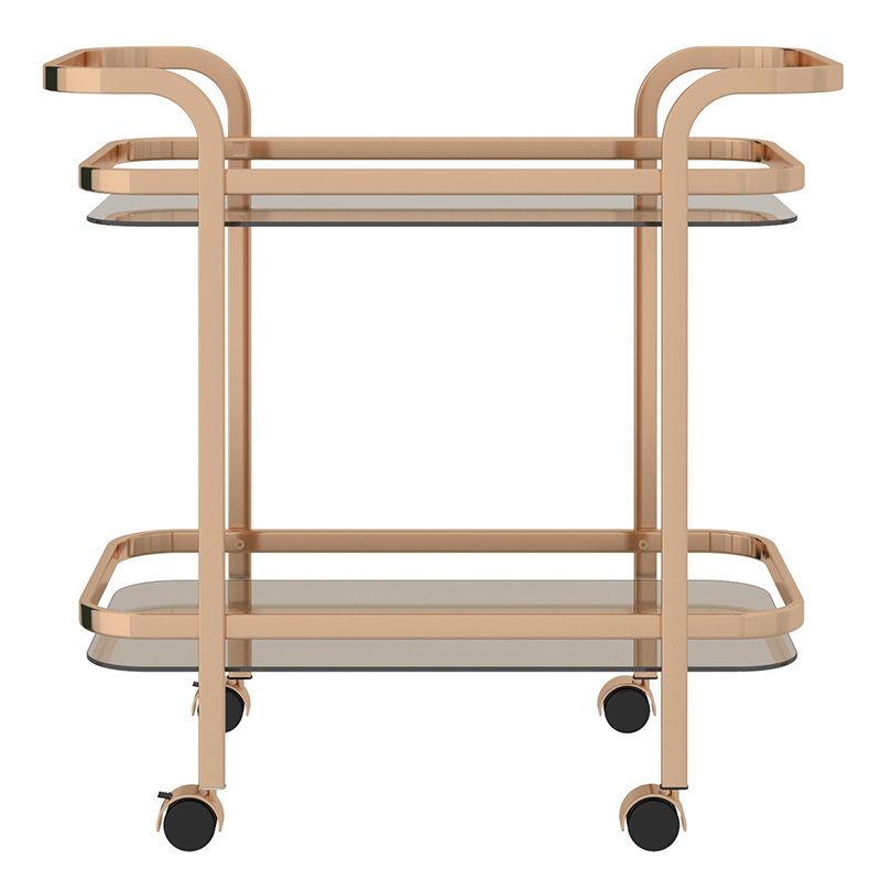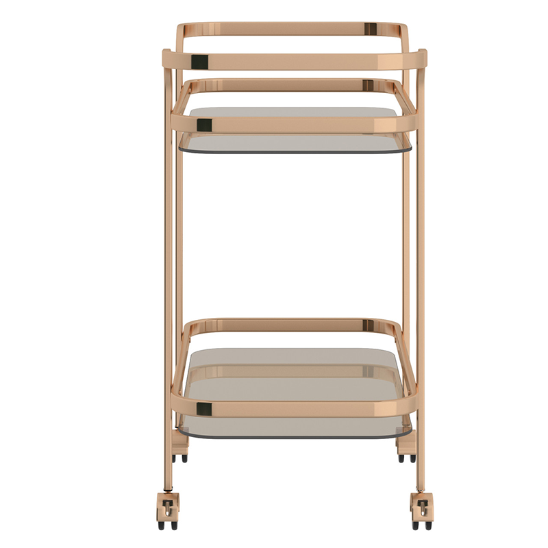This 2-tier trolley is a functional furnishing with an edgy twist. Designed in a contemporary fashion, this gold-finished piece has a top shelf that is outfitted with a 5mm-thick smoked tempered glass shelves. The translucent nature of the glass allows you to see every facet of this trolley through its top while the smoky hue creates a lustrous atmosphere. With plastic wheels that rotate 360 degrees allowing for full maneuverability and have a locking capability, this versatile trolley can be showcased from every angle. Whether you’re serving up the cocktail of the hour or hors d’oeuvres fresh out of the oven, this trolley will be the highlight of the night.
