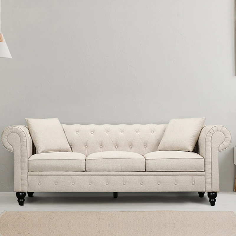 Designer Linen Rolled Arms Chesterfield Sofa (Beige)